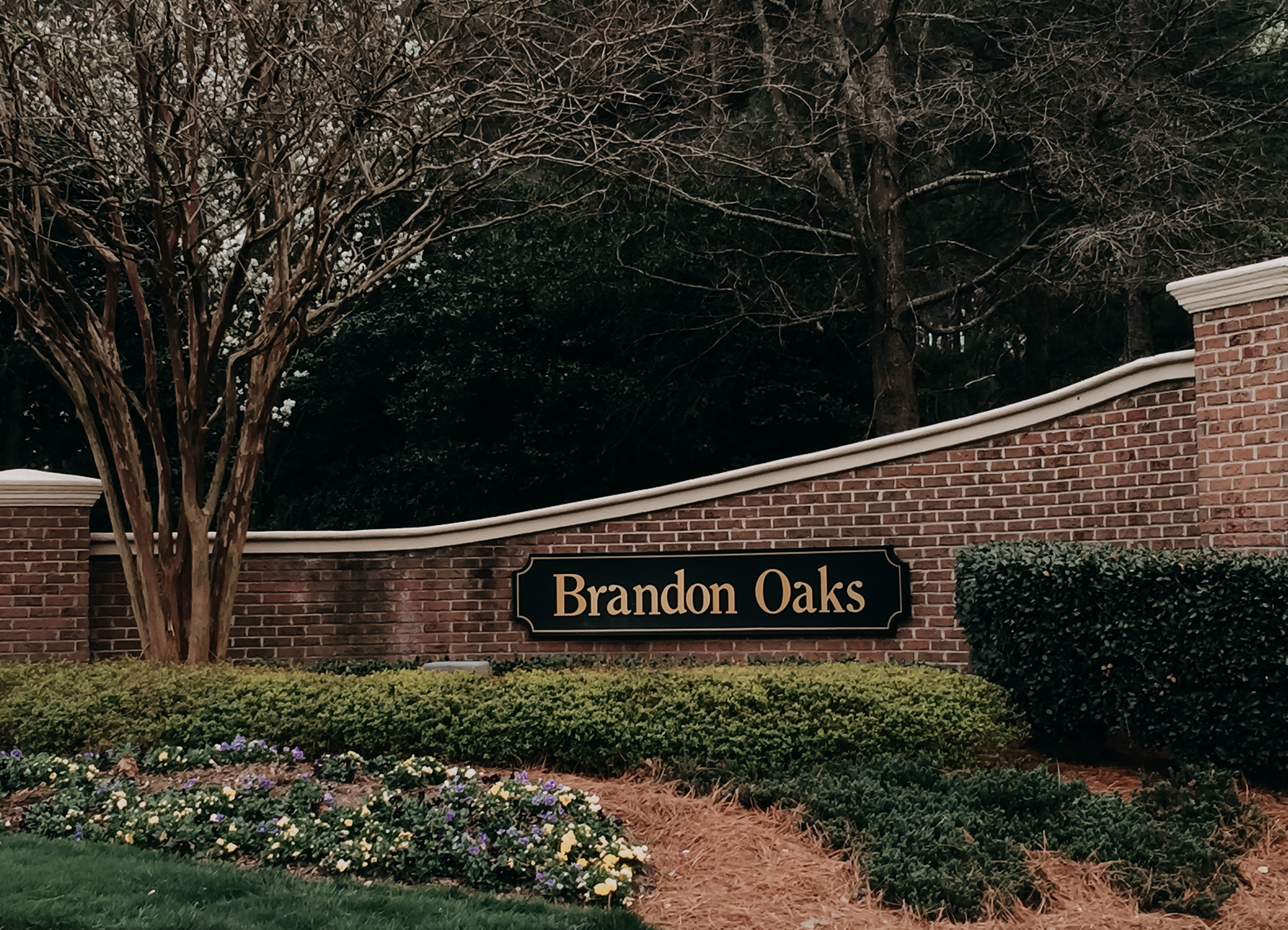 Brandon Oaks is divided into 16 sections: Braxton, Carlisle, Summerston I, Summerston II, Courtfield, Ashgrove, Fenwick, Morning Creek, Rosewater, Fountainbrook, Bridleside, Cooper Ridge, Currier, Spanish Moss, Forest View, and The Gardens.